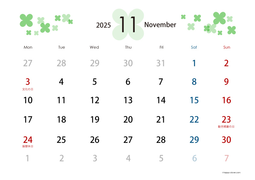 2025年11月 四つ葉のクローバーカレンダー A4横型 月曜始まり