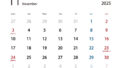 無料でダウンロードして印刷してご利用いただける、2025年11月のカレンダーテンプレートのPDFデータです。