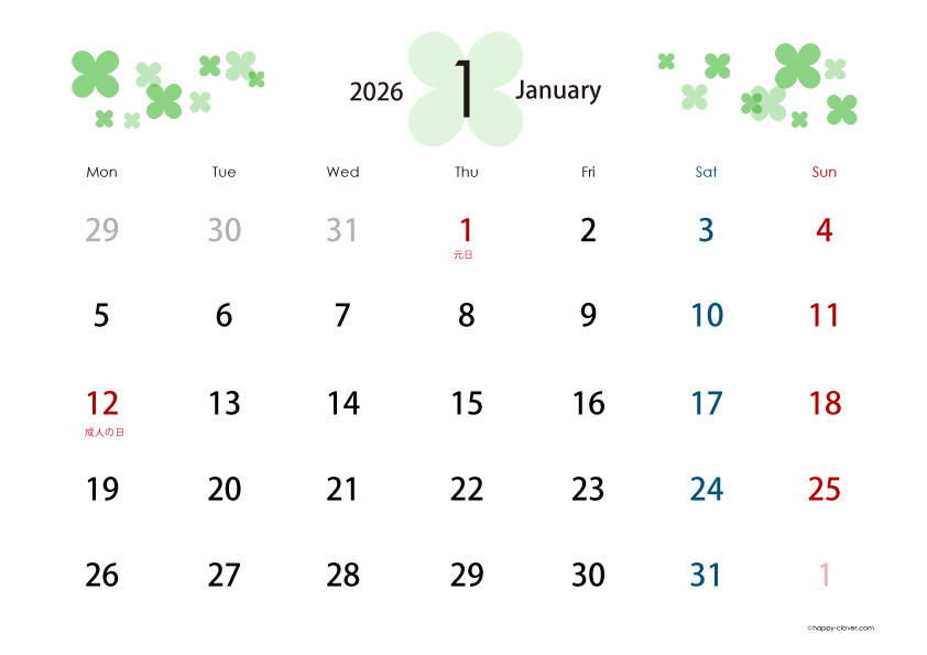 無料でダウンロードして印刷してご利用いただける、2026年1月のカレンダーテンプレートのPDFデータです。